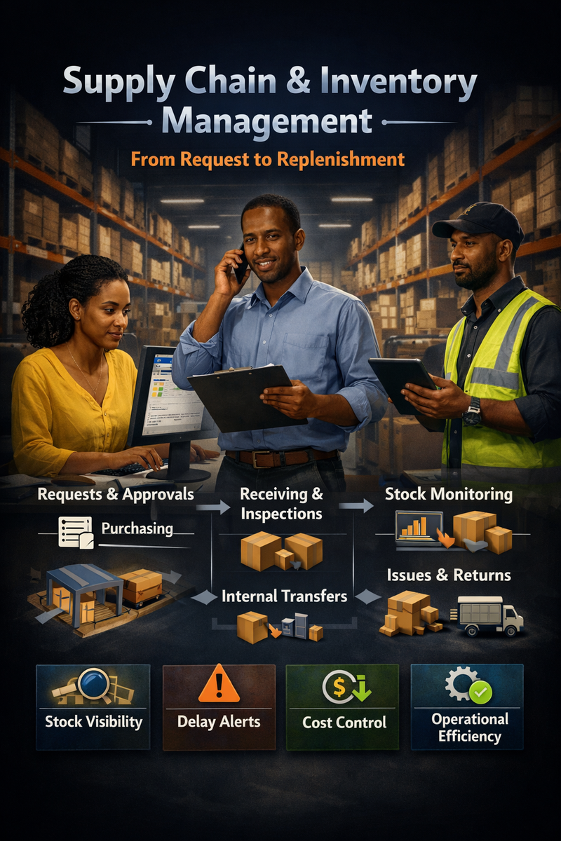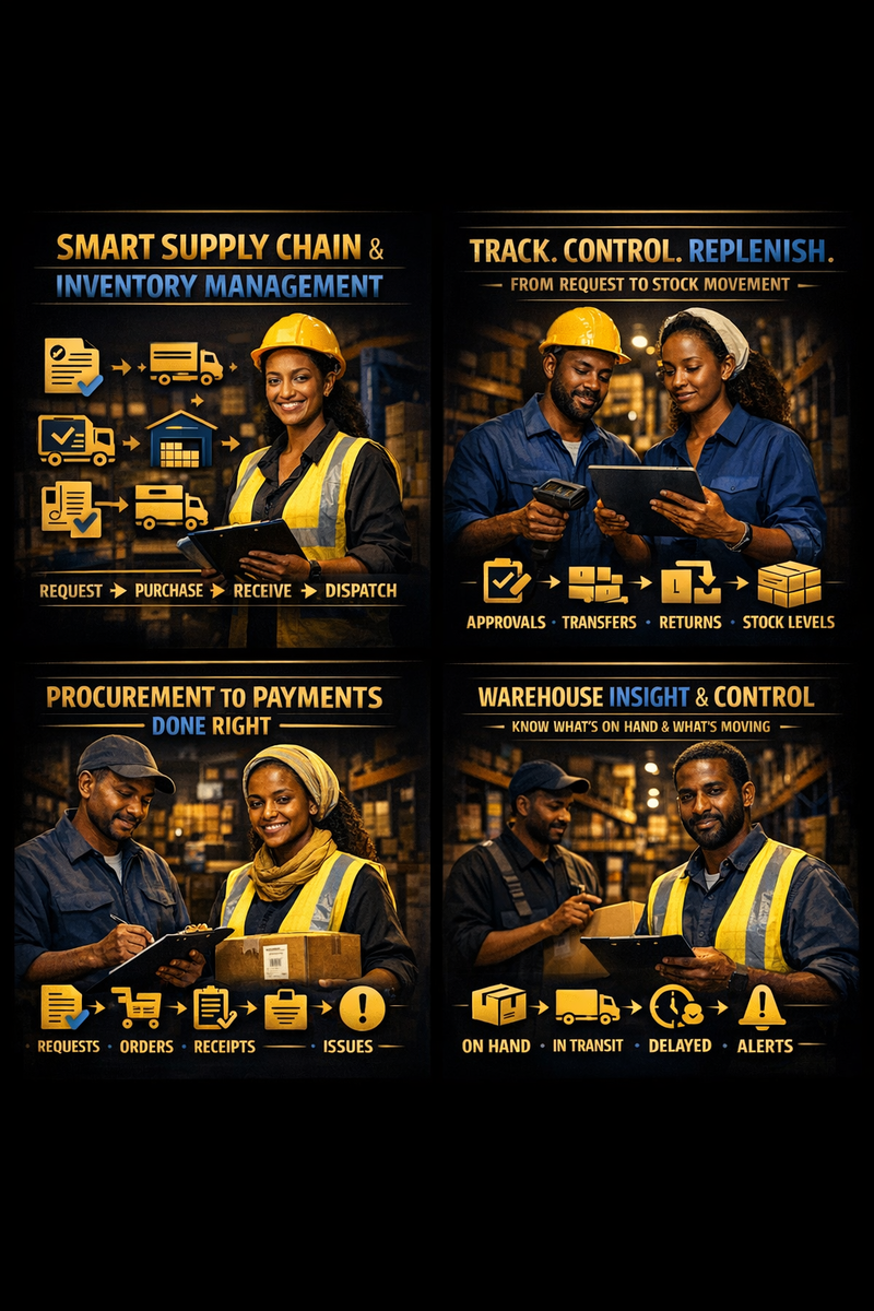 The supply chain, inventory, and warehouse module group is designed to give the business clearer material control from request to replenishment to stock movement. It supports the practical work of purchasing teams, store teams, warehouse controllers, and managers who need to know what is on hand, what is moving, what is delayed, and what needs attention before it becomes a cost problem.